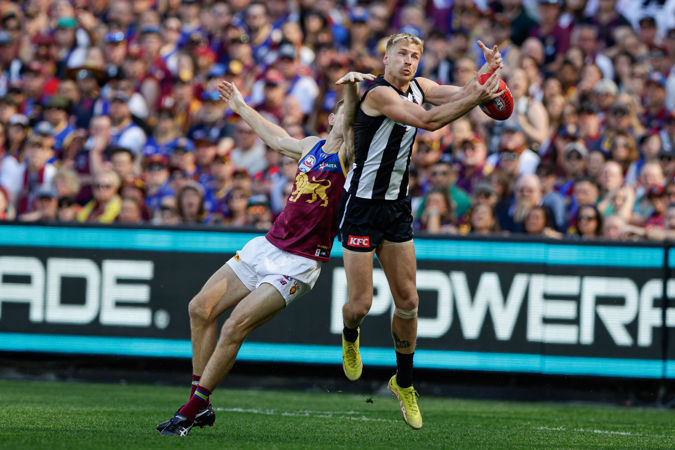 Billy Frampton forcing Harris Andrews’ to be defensively accountable during the 2023 AFL Grand Final between Collingwood and Brisbane (Photo by Russell Freeman/AFL Photos)