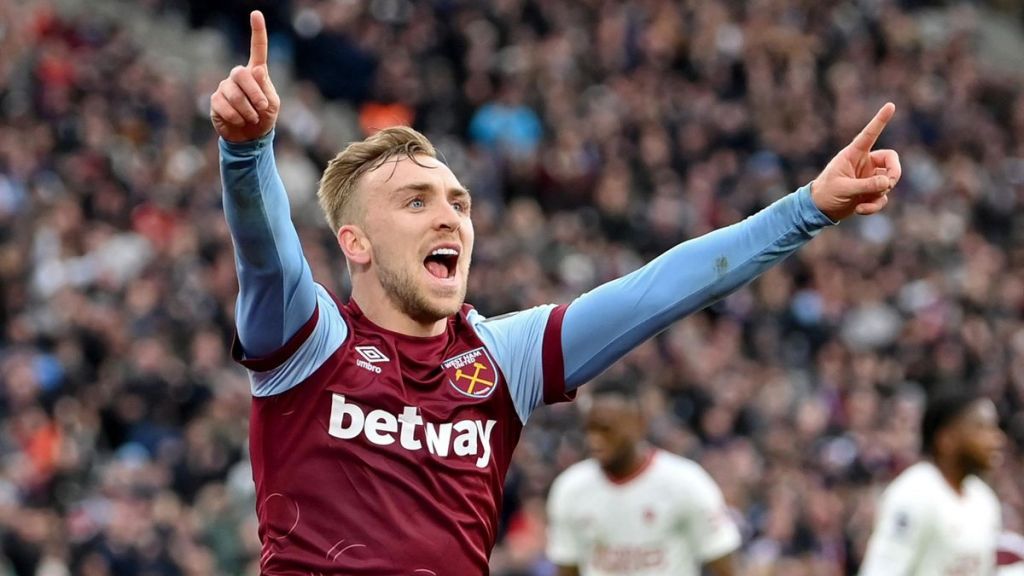 Bowen celebrating his goal against Manchester United, which West Ham went on to win 2-0, in 2023