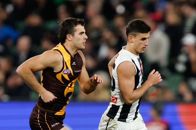 Finn Maginness stalking Nick Daicos as Hawthorn hosted Collingwood at the MCG, Round 21 2023 (Photo by Dylan Burns/AFL Photos)