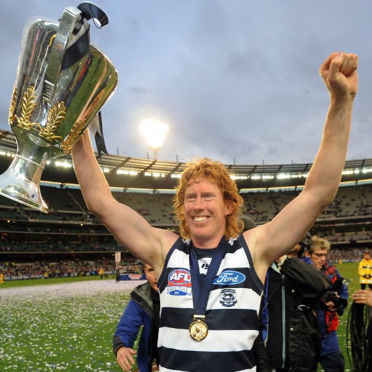 Cameron Ling proudly wielding the Premiership Cup after Geelong defeated Collingwood in the 2011 AFL Grand Final