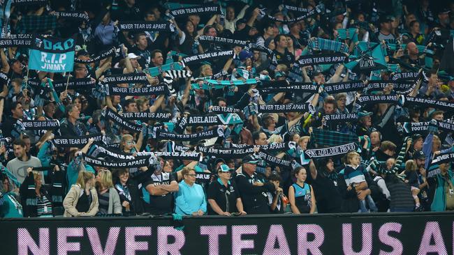 Port Adelaide fans proudly adorning their scarves during a home rendition of INXS’ Never Tear Us Apart